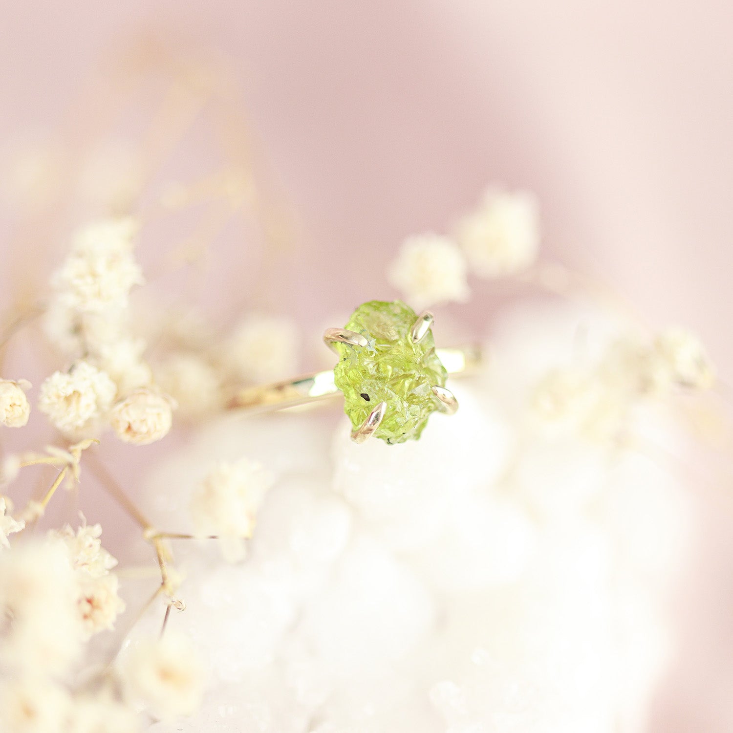 Deze Ruwe Peridoot gouden ring laat jou stralen als een prachtige ster in het donker. Ze geeft jou de ontspanning die jij nodig hebt in een drukke periode. En geeft je kracht en zelfvertrouwen wanneer jij naar haar kijkt. Deze prachtige helder groene Peridoot is de geboortesteen van de maand augustus.